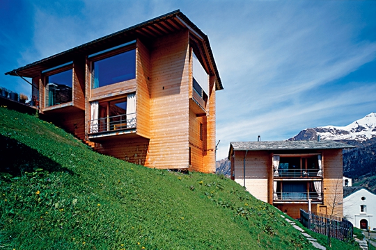 Kod kuća u Leisu drvo nije upotrebljeno kao plašt niti kao maska, već kao masivna drvena građa svih zidova, a tek je u kontaktu s tlom upotrijebljen beton. Grede široke 11 cm, visoke 20 cm i dužine do 6,60 metara slagane su jedne iznad drugih, povezane klasičnim tesarskim vezovima kao što je npr. lastin rep. Svi elementi potrebni za gradnju - zidne i stropne grede, prozorski okviri, metalne poveznice, osobito dugački vijci, čelične razupore i slično - sve je to prefabricirano i pripremljeno za ugradnju stiglo na gradilište.