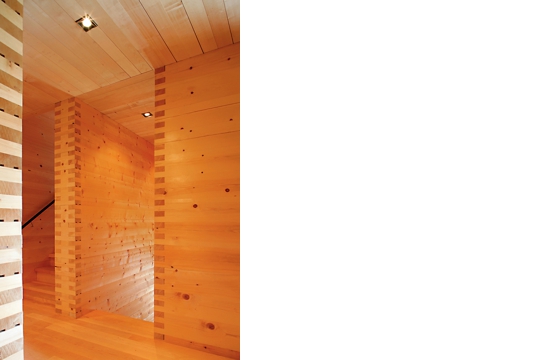 Konstruktivni sistem tradicionalne seljačke kuće od četiri zida koja čine neku vrstu krute kutije, omogućava tek manje otvore. Kako je jedna od bitnih arhitektovih intencija bila uvesti prirodu i krajolik u kuću, trebalo je naći ravnotežu između poštivanja tradicije zatečenog okoliša i novih želja i potreba. Taj je akt balansa arhitekt izveo zaista dojmljivo, uvodeći veći broj tradicionalno konstruiranih drvenih ‘kutija’ koje zatvaraju služeće prostore: stepeništa, kupaonice, spremišta, garderobe. Te kutije povezane stropnim konstrukcijama čine nosivi sustav kuće, a između njih omogućena su ostakljenja u čitavoj visini prostorija.
