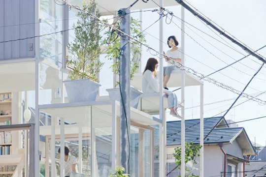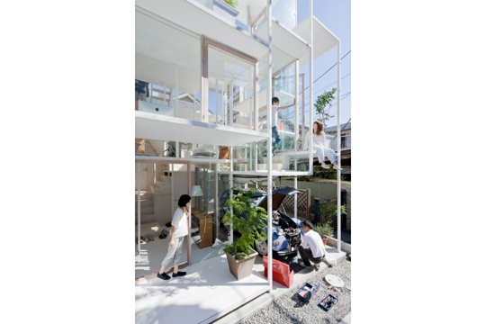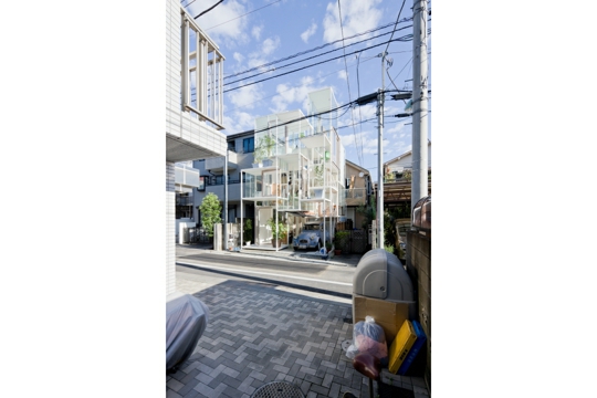 I recentna realizacija, kuća NA, istovremeno je ‘primitivna’, prije svega u konstrukciji i materijalima, i apsolutno ‘futuristička’ u smjelosti svoga formalnog izričaja, organizacije i načina života u njoj. Projektirana je za dvočlanu obitelj u gusto naseljenoj stambenoj četvrti Tokija, na svega 75,79 m2. Osnovni je koncept potekao od gotovo djetinje jednostavne, ali poetične ideje života u krošnji drveća gdje je svaka grana jedinstveno mjesto, ali uvijek povezana sa svima ostalima.[4] Međutim, ova naoko naivna ideja, rezultira izuzetno kompleksnom prostornom strukturom u kojoj su pojedini sadržaji kuće organizirani u različitim visinskim pomacima koji više podsjećaju na organizaciju polica ormara nego etaža kuće. I doista, sobe ne postoje kao zasebne prostorne cjeline, već su stalno međusobno povezane, uzajamno se redefinirajući u penjanju kroz njih, baš poput iskustva penjanja po granama u krošnji drveta.[5] Taj osjećaj dodatno pojačava sam materijalitet kuće – međukatna konstrukcija izrađena od tankih ploča koje počivaju na, za naše pojmove, nezamislivo vitkoj konstrukciji od kvadratnih čeličnih profila visine svega 65 mm za grede i 55 mm za stupove. ‘Etaže’ tako gotovo lebde u prostoru, svojim različitim visinama diferencirajući pojedina korištenja ili ambijente, dajući uvijek novu sliku i odnose pomicanjem korisnika kroz kuću. Tjelesnost doživljaja pojačava ‘skučenost’ prostora koji je proporcijama bliži gigantskom ormaru, nego li maloj, ‘običnoj’ kući. Tu ‘skučenost’ kompenziraju vanjske opne/zidovi koji su najčešće staklo, otvarajući s jedne strane život kuće gradu i s druge strane dozvoljavajući da grad i ulica budu dio kuće.