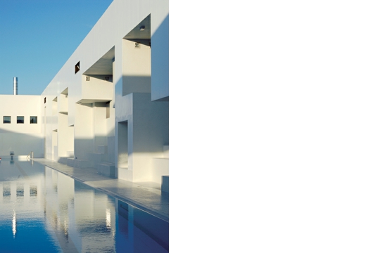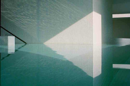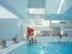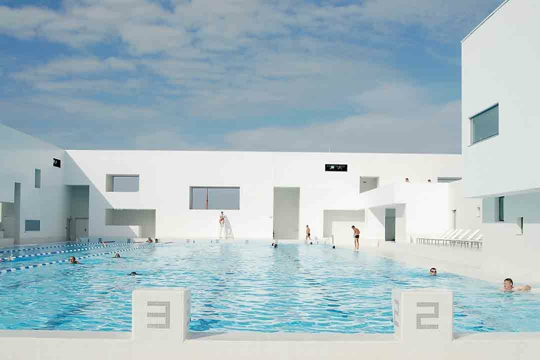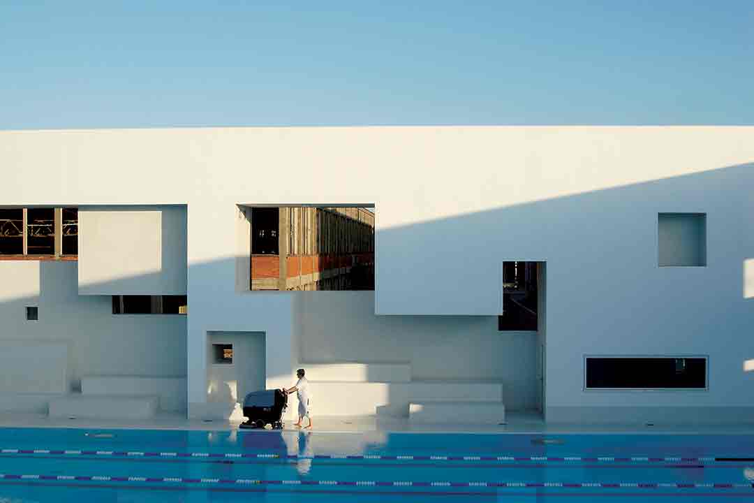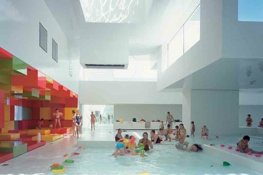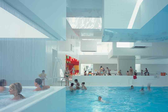 Posjetitelj već na samom ulazu uranja u savršeno čist ambijent, popločen sjajno bijelim pločicama od fajanse na kojima se reflektira zenitalno svjetlo. Difuzno svjetlo koje dolazi kroz nadsvjetla filtrira se kroz serigrafiju vodenih motiva koja na bijeloj površini stvara odraz valova. Ugođaj je pretjerano osvijetljen, gotovo nestvaran, prostor i vrijeme su prekinuti. Nude se dva prolaza: jedan vodi do bazena, a drugi do balneoterapije. Prvi prostor je namijenjen djeci. Za sasvim malu djecu izgrađen je prostrani dječji bazen od 100 m². Jedna niša, sa strane bazena, namijenjena je djeci i presvučena je polutvrdim jastucima živih boja koji ponavljaju volumetrični princip cjeline. Ploha žute i crvene boje odskače u eteričnom prostoru i naposljetku još više naglašava njegov dojam. Vani je glavni grijani bazen dugačak 50 m, koji čini 8 traka. Za vrijeme natjecanja izvlače se teleskopske tribine. Otvori prema vanjskom krajoliku i klupe prizivaju klasični vokabular moderne arhitekture: igru volumena i kadrirane poglede. U prostoru balneoterapije smješteno je više bazena prema načelu antičkih kupelji: kaldarij (rimska sauna) s temperaturom od 42º C i frigidarij s temperaturom od 18º C. Ostali bazeni nude ‘zone za opuštanje’ s mlazovima vode pod jakim pritiskom. Najgorljiviji kupači jednako tako imaju pristup i do hamama, odnosno turske kupelji i dvije saune. Pomalo začuđujući prostor za meditaciju: nizak volumen, po stijenkama teče voda. Svlačionice iznenađuju. Nema ničeg poznatog u tim prostorima okupanima prirodnim svjetlom gdje se kabine zatvaraju debelim plastičnim zavjesama. Stropovi, posvuda od zategnutog platna sa umetnutim rasvjetnim tijelima, prije podsjećaju na izložbeni prostor nego na tradicionalni bazen. Sistem označavanja je profinjen - jednostavno napisane oznake na spojevima pločica, koje čine okvir jednog otmjenog jezika.