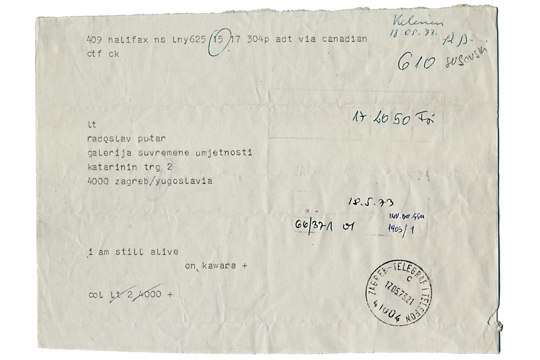 U sekciji konceptualne umjetnosti Sol Lewitt izlaže ‘Zidnu sliku’ koju su stvorili postavljači izložbe prema tekstualnim uputama koje stanu u jednu rečenicu [10], a koju možemo promatrati i kao program (algoritma nacrtne geometrije izraženog tekstom). Izložen je medijski osviješten rad ‘I am still Alive’ On Kaware, ostvaren u pet istovjetnih telegrafskih poruka unaprijed adresiranih na Radoslava Putara, direktora zagrebačke galerije i predsjednika organizacionog odbora ‘Tendencija 5’. Strukturu rada možemo također smatrati programom, a rad kao svoju materijalizaciju koristi informacije i (tele)komunikacije, te je po sadržaju i institucionalna kritika i ujedno govor umjetnika u prvom licu.