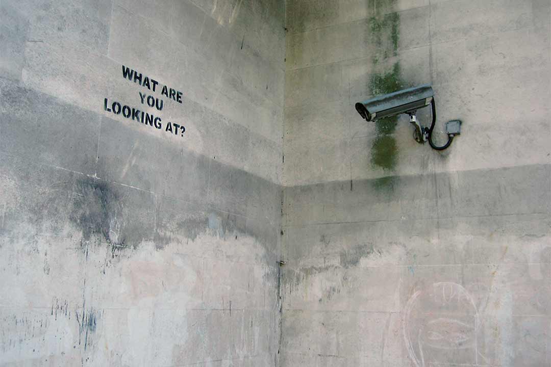 Banksyjevo shvaćanje umjetnosti kao subverzivnog i političkog oruđa još bolje do izražaja dolazi u njegovu vlastitom radu. Velik broj njegovih djela usmjeren je protiv CCTV kamera koje sve više preplavljuju Veliku Britaniju. Jedan od najboljih primjera je zasigurno grafit s natpisom What are you looking at? pokraj kamere blizu Hyde Parka u Londonu. Upravo tim natpisom i kamerom koja je usmjerena na njega Banksy - da iskoristimo Platonove, odnosno Lacanove termine - aktualizira privid da se u Velikoj Britaniji još uvijek radi o demokraciji, a ne o ‘društvu nadzora’. Prema jednoj studiji broj kamera u Londonu je 500.000, dok ih u čitavoj V. Britaniji ima oko 4,200.000 (što znači da postoji jedna kamera na 14 ljudi). Prosječna osoba koja ide na posao, u školu, na fakultet ili naprosto obavlja stvari po gradu navodno može za samo jedan dan biti snimljena čak 300 puta. 3 Godine 2003. uvedene su i tzv. Talking CCTV, kamere za videonadzor sa zvučnicima, preko kojih službenici osiguranja mogu opominjati prolaznike, itd. Argument je sljedeći: te ‘govoreće kamere’ služe za sprečavanje ruiniranja ulica grada, za vandale koji grafitiraju jednako kao i za prolaznike koji bacaju smeće. Da se ‘obični’ Britanci baš i ne slažu s takvim novim stanjem, potvrdila je i YouGova anketa objavljena krajem 2006., koja je pokazala da 79% Britanaca smatra da je Velika Britanija postala ‘društvo nadzora’. 4