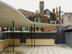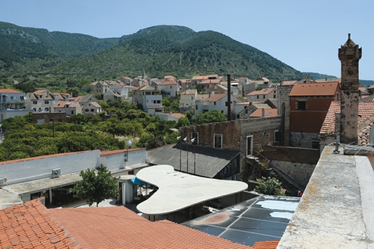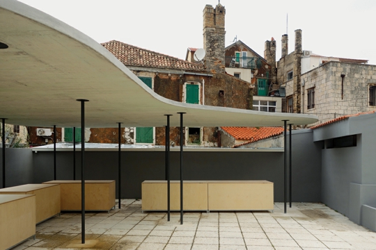 Disk nadstrešnice pluta nad dvorištem. Bestežinski dojam diska ostvaren je njegovom debljinom, arpovskim krivuljama i tankim čeličnim stupovima s kapitelima.