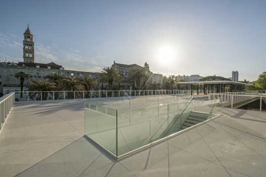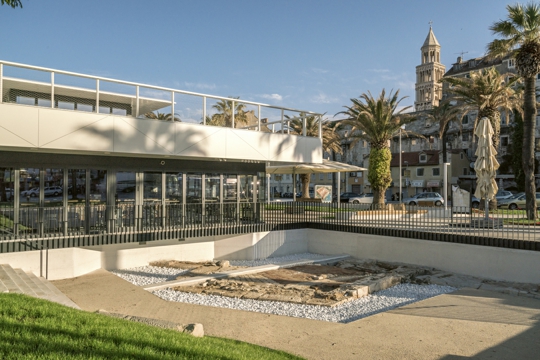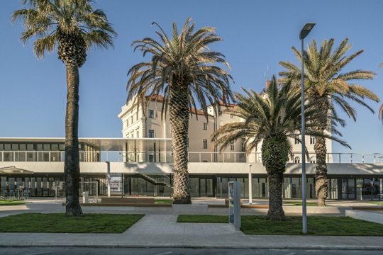 Usprkos snažnom duhu mjesta (genius loci), zahtjev rješenja situacije najmanje je jednako kompleksan kao i kada je izgrađena. Utvrđivanjem granice obuhvata i zoniranjem prostora reinterpretira se oštećena urbana jezgra. Zoniranje kreće od postojećeg parkirališta na sjeveru preko prvog reda palmi s prodorima koje stvaraju točke okupljanja posjetitelja oko turističkih plakata, preko šetnice koju naglašava duga linija klupa izlivenih u bijelom betonu, do zelenila koje svojim meandarskim usjecima stvara ograđenu zonu terasa ugostiteljskih objekata. Završetak je sama kontaktna zona fasade i trijema Turističke palače. Stražnji prolaz prema uglovnici Lučke kapetanije pretvara se u intimniji javni prostor, kaletu, koji prolaskom ispod trijema terase uvlači šetača te postavom otvorenog stubišta sugerira postojanje određenog akcenta na terasi.