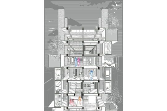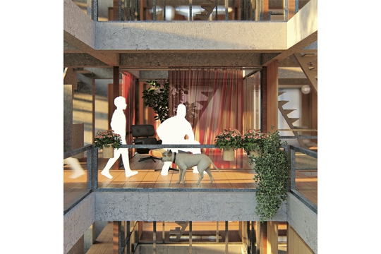 Vertikalni volumen zgrade kombiniran je s tlocrtnom organizacijom koja odražava predloženi društveni spoj. Visina zgrade omogućava povezivanje neiskorištenih krovnih površina okolnih zgrada u integralnu cjelinu kojoj se pristupa iz zgrade.