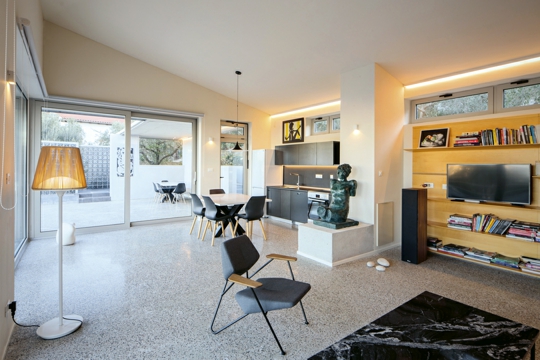 Stavljajući vrijednost pogleda ispred orijentacije (primarni prostori orijentirani su k uvali, na sjever) i propuštajući južno svjetlo preko manjih otvora s visokim parapetom odgovara i kontekstu, jer njegove su kuće sve dobro stavljene, stvarno lokalno kontekstualne, na stale iz potrebe korisnika i mjesta nastanka, crtane skupa s tlom, s dvorištem, koje je početkom projektiranja odrednica kuće, a krajem postaje fokus prostora življenja gdje se pretapaju kuća, terase i dvorište u nedjeljivu cjelinu, tako da zidovi nestanu i postanu dio neke samodovoljne kartografije.