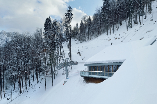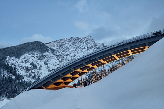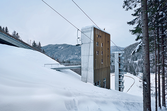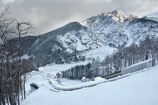 Oblikovanjem luka ispod vrha doskočišta skakaonica iskazuje poštovanje prema inženjerskoj tradiciji prvog konstruktora tog objekta, inženjera Stanka Bloudeka. Umjesto drvenih, odnosno kasnije betonskih stupova, koji su podupirali uzdignuti dio doskočišta, koncipiran je vitki luk s rasponom od 40 metara. Tim lukom skakaonica ostvaruje prostorni prozor koji uokviruje karakterističnu siluetu planinske skupine Ponca. Upotreba poglavito dvaju materijala, betona i drveta, odgovara materijalnom kontekstu prirodnog krajolika. Oblikovanje je suzdržano i traži neposredni dodir s topografijom. Naročite strukture, luk na vrhu doskočišta i oba tornja se s jedne strane drži različitih konstrukcijskih okvira, a s druge strane jednostavnim oblikovanjem bez nepotrebnih detalja nastavlja se na konceptualnu logiku tradicionalne izgradnje u sjevernoj Sloveniji.