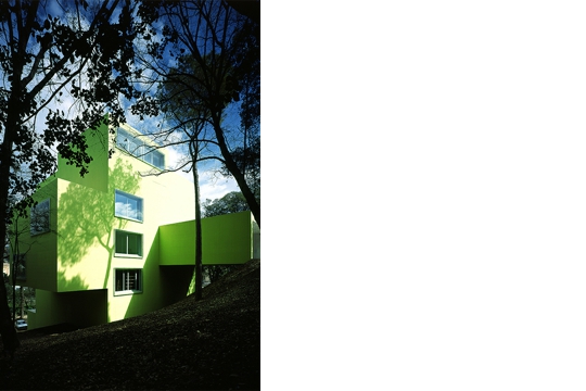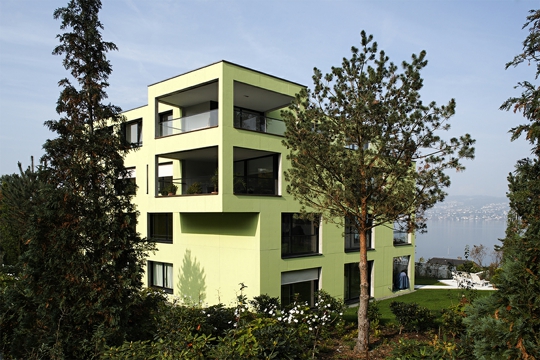 Kod stambenih zgrada su razlozi za primjenu ili izostavljanje boje bili raznoliki. Jedan od razloga je zaista bio način konstrukcije sa vanjskom ožbukanom izolacijom. Reagirali smo na to tako da smo žbuku napeli kao kožu i nismo joj dali neku tipičnu mineralnu boju, bijelu, bež ili sivu. Kako bismo ukazali na to da je ispod žbuke ‘organski’ materijal (na bazi ugljika – ekspandirani polystyrol), koristili smo ton smeđe boje kakav možemo naći u organskim materijalima poput drva, kože, humusa. Prozorima smo nastojali izraziti luksuz pogleda na krajolik, park i na jezero, pa smo zato razvili napadno uokvirene prozore, koji poput ‘očiju’ mogu ‘konzumirati’ vidik.