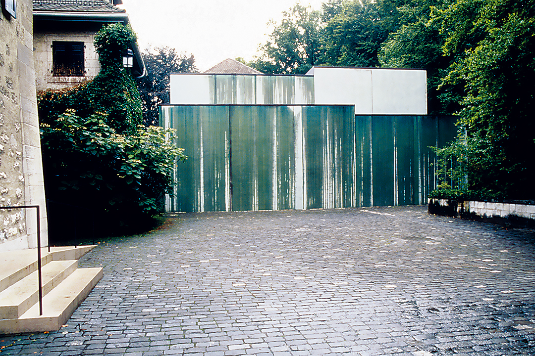 Gigon: Kod Römerholza se radilo o neuobičajenom pokušaju da se nadomjesnim zgradama adaptira ta historicistička zgrada iz 1914. sa njenim proširenjem iz 1925. godine – biti im nalik, ali ne pomoću detalja i forme, već na posve drugačiji način. Budući da je vila građena u stilu francuske renesansne ladanjske kuće, a zapravo izgleda kao da je daleko starija, htjeli smo novoj zgradi također dati ‘lažnu’ dob. Razmišljali smo o bakru; to je materijal koji se najbrže mijenja od novog prema starom, pa i vizualno mijenja svoj karakter. To je moguće ubrzati, što se uvijek radilo kod lažnih antikviteta obrađivanjem kiselinama ili polaganjem u gnojište. U dućanu igračaka našli smo bakreni prah i time smo dali tretirati uzorke betona, a onda smo promatrali njihovo mijenjanje pod utjecajem atmosferskih pojava. Usput smo istraživali kako vapnenački kamen reagira s bakrom i da li iz toga nastaje neka vrsta boje kože, nalik na slike aktova u zbirci. No isprva rezultat nipošto nije djelovao uvjerljivo. Ali je jedan od tih uzoraka duže vrijeme ležao na podu obrnuto; kada smo ga okrenuli, bio je već posve zelen. To je onda bila kombinacija koju smo odlučili izvesti. Na kraju je mješavina betona bila poput ‘čarobnog napitka’ - sa smrvljenim ‘dodatnim materijalima’, kakvi su već došli do izražaja kod vile – kamen krečnjak i bakar. Te su ploče uslijed polijevanja ubrzo postale dosta zelene. Uz to smo krov napravili od bakrenog lima, a po kiši se voda s njega slijeva po fasadi, čestice bakra se na njoj talože. Nakon deset godina je tu sada i neka vrsta ‘crteža od kiše’ – akvarela, koji postaje sve izrazitiji – nalik na podnožja brončanih skulptura.