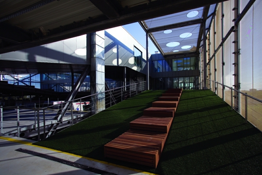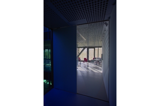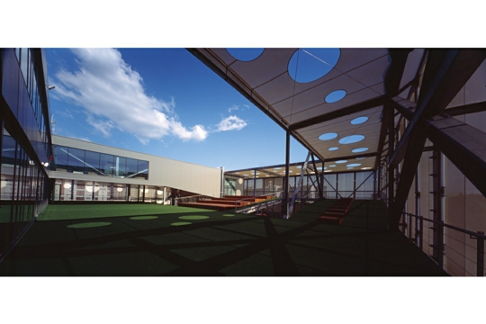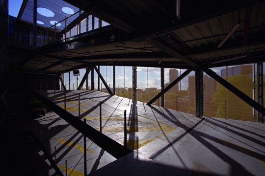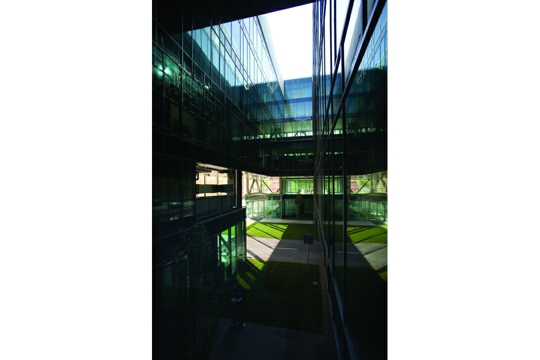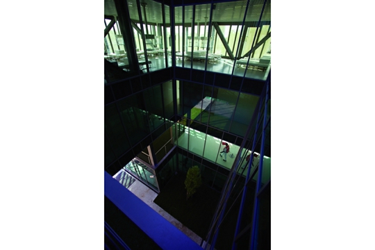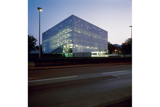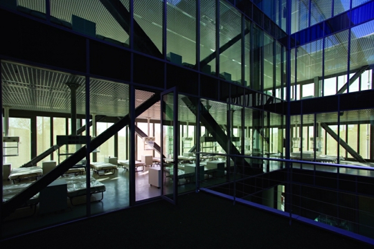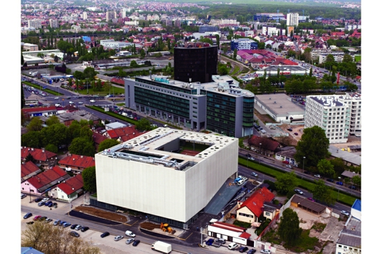 Dvije su projektantske odluke ključne za koncepciju zgrade: prostorna poroznost njenog tijela te čelična nosiva konstrukcija. Obje odluke su logično inspirirane jednostavnom strukturom višekatnog otvorenog parkinga koji asocira na Koolhaasv fold – kontinuirana prostorna konfiguracija u kojoj se nižu različita događanja – pa se arhitektonski motivi otvorene terase ili rampe ponavljaju u raznim funkcionalnim sklopovima zgrade i to kao ‘prostori dokolice’ ili edukacijski sadržaji. Tako je prostorni ekvivalent rampe garaže u interijeru konferencijska dvorana, a na aktivnoj otvorenoj zadnjoj etaži taj motiv se ponavlja u zakošenoj terasi-auditoriju s umjetnom travom i drvenom palubom. Terase su pak vanjski produžeci prostora za boravak zaposlenika koji se razvijaju unutar vanjskog platnenog plašta zgrade. Tim prostornim elementima horizontalnog usmjerenja pridružuju se vertikalni prodori koji teku po čitavoj visini zgrade. Jedan atrij uvodi prirodno osvjetljenje u blok sa stacionarom koji je prozračan i dvostrano orijentiran, dok je i garaža vertikalno integrirana i povezana s krovnom terasom putem dva dodatna prodora.