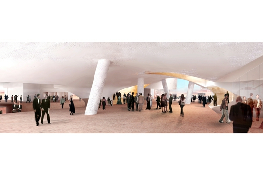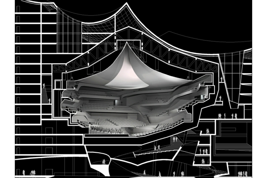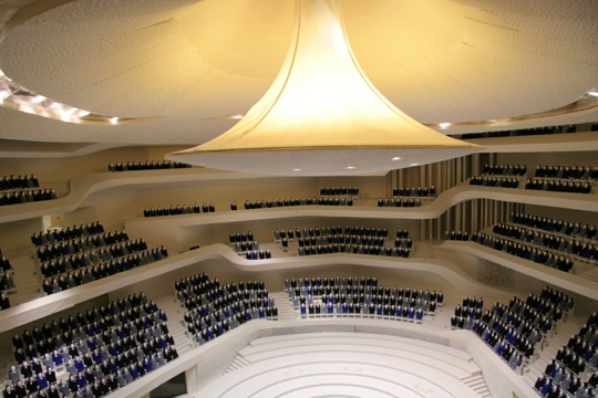 U središtu nove filharmonijske zgrade velika je dvorana koja može smjestiti 2150 osoba u redove koji okružuju sve četiri strane pozornice. Iako Herzog & de Meuron spremno priznaju divljenje radu Hansa Scharouna na berlinskoj Filharmoniji iz 1963., prilikom projektiranja velike dvorane htjeli su se znatno odmaknuti od banalnih kopija njezina oblika ‘vinograda’ koji je preplavio suvremene koncertne dvorane. Taj su oblik podigli na sljedeću razinu, stvarajući volumen koji je mnogo strmiji i publiku još više približava orkestru. Poput recentnih projekata stadiona Herzoga & de Meurona u Baselu (2002.), Münchenu (2005.), i Pekingu (2008.), rezultat je prostor koji određuju tijela gledatelja. Snažna arhitektonska gesta dovodi do dramatičnog audiovizualnog odnosa između gledatelja i izvođača.
