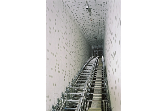Odluka da se Elbphilharmonie gradi na vrhu postojećeg skladišta još je jedna potvrda interesa i poštivanja kvalitete industrijskih zgrada od cigle arhitekata Herzoga & de Meurona. Njihova transformacija hale za turbine bivše elektrane Bankside iz 1952. u galeriju Tate Modern (2000.) rezultirala je najuspješnijim javnim prostorom našeg doba. U Madridu su Herzog & de Meuron zadržali fasade od cigli središnje elektrane iz 1902. kao dio građevine CaixaForum (2008.). Kao rezultat jednog od vještih formalnih manevara po kojima su Herzog & de Meuron poznati čini se da zidovi elektrane lebde iznad javnog trga. Iako se čini da ova gesta prkosi težini zida, u isto vrijeme ponovno potvrđuje njihovu masivnost kompresijom prostora ispod njih. Glavna intervencija Herzoga & de Meurona unutar skladišta Kaispeicher uvođenje je zakrivljenih pokretnih stepenica koje povezuju ulaz u Elbphilharmonie s javnim trgom koji se nalazi u visini izvornog krova skladišta. Zakrivljenost pokretnih stepenica preobražava ovaj dugački i potencijalno monoton prolaz u senzualno otkriće, koje završava ispred velikog prozora zapadnog ruba skladišta Kaispeicher. Taj je otvor dio izvornog skladišta; još je jedan primjer kako je postojeća zgrada upravljala, čak diktirala, oblik nove filharmonijske zgrade.