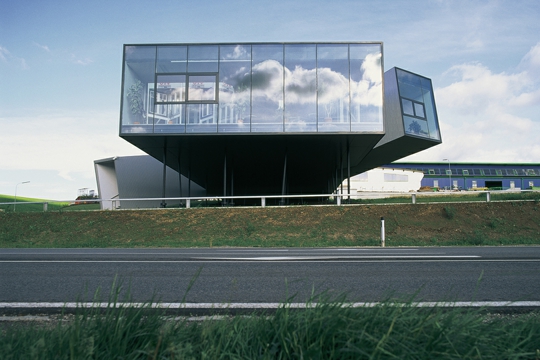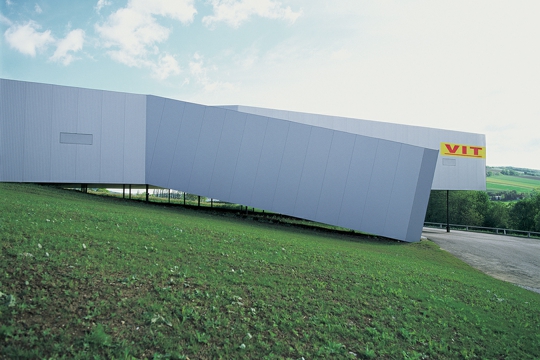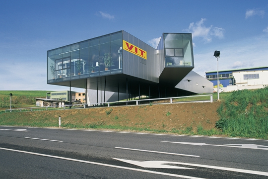 Poslovnu zgradu VIT u Aspernhofenu, koju su projektirali querkraft-architekten, čini fascinantnom snažni logo izrazite pregnantnosti. Šest metara iznad tla izbijaju iz blagog brežuljkastog krajolika srebrnasta divovska cjevasta forma i dva sekundarna kosa kraka. Završetak tvori ogromni izlog iznad ceste; sve djeluje kao reklamna poruka koja je postala oblikovani prostor postavljen na potpornje. Zgrada koje se ne zaboravlja.