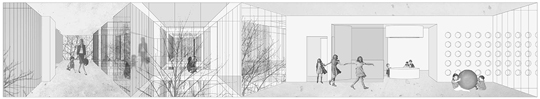 U našem slučaju postoji centar – križište dviju osi – koji se ne doživljava u životu vrtića. On je tek sekvenca u prolazu prema žarištima koja se nalaze okolo – prije svega vrtićkim jedinicama.