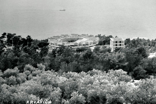 ‘…ruševina ‘propuh’ stanja nalazi se i u Krvavici, malom pitoresknom mjestu udaljenom od Makarske 3 km zapadno. Ovaj objekt nekad je bio vojni hotel, a mislim da je danas u vlasništvu Cluba Adriatic. Dakle, u maloj šumici na samoj plaži nalazi se ovaj, kružno kao svemirski tanjur arhitektonski riješen nekadašnji hotel. Tablu recepcije sam pronašao u jednoj sobi, a objekt ću upamtiti po tome što je prepun perja. Perja na sve strane.’¹