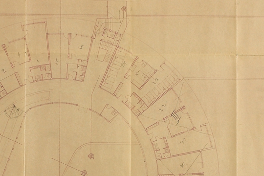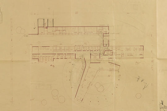Niski ukopani blok završava četverokatnom stambenom zgradom za osoblje bolnice.