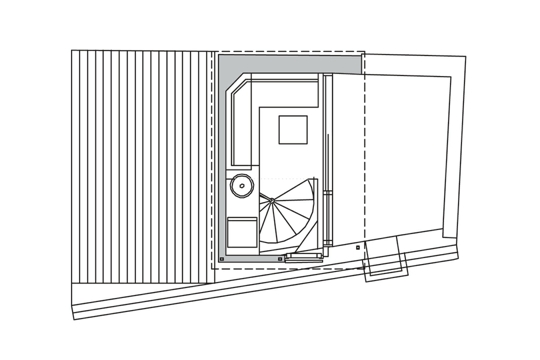 Dugo se vremena fluidnost modernističke prostorne organizacije smatrala ključnim faktorom uspješnog privatnog stambenog prostora (pa tako i onoga namijenog odmoru). U zadanom kontekstu arhitekti Dražen Juračić i Jelena Skorup nisu bili u mogućnosti ishoditi povezivanje unutrašnjeg s vanjskim – intimnim – prostorom, pa je stoga svo zbivanje ograničeno unutar kuće. Točnije, sve do svojevrsne kulminacije – male terase s koje se (konačno) pruža pogled u širi prostor, a koju doživljavamo kao spomen na tradiciju ljetnih kuhinja smještenih na terasama kuća u povijesnim urbanim sredinama jadranske zone.