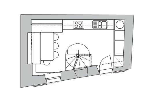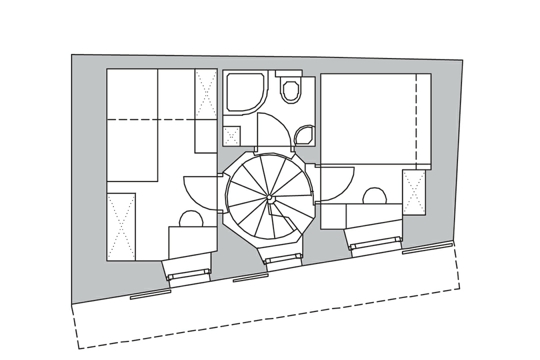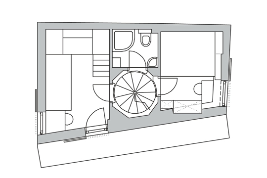 Pozicija i veličina parcele, njezina skučenost i nepravilnost te dokazano najstariji prizemni sloj argumenti su koji govore u prilog tezi da se isprva nije radilo o stambenom, nego gospodarskom objektu, što je u određenoj mjeri omogućilo slobodniju prostornu razdiobu. Nakon rekonstrukcije unutrašnjost je podijeljena u četiri etaže: kuhinja i boravak u prizemlju, dva kata (svaki s po dvije spavaće sobe i kupaonicom) te potkrovlje djelomično zaključenog jednostrešnim krovom, dok drugi dio zaprema mala terasa s koje se otvara pogled na jezgru naselja te na sjeverni i istočni dio otoka.