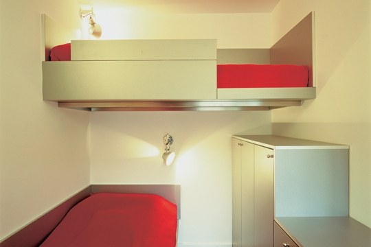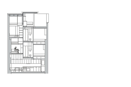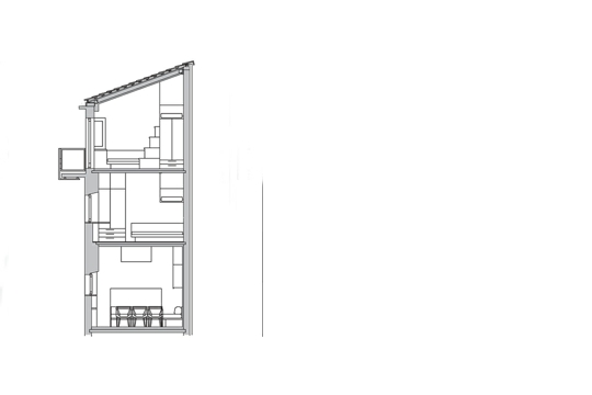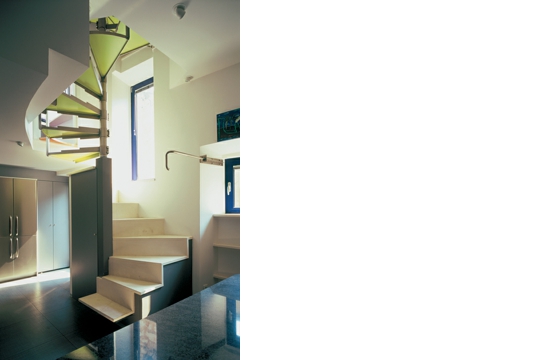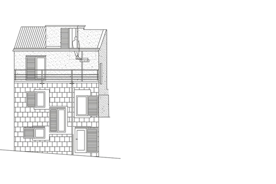 Povijesna slojevitost primjećuje se na pročelju primarno zbog rasporeda i različitih veličina otvora. Nakon recentne pregradnje otvori su udruženi na nov, grafički zanimljiv način naslućujući dinamiku kretanja uvis postignutu u unutrašnjosti postavom stubišnog “jedra” uz pročelni zid. Krajnje racionalizirana prostorna organizacija postignuta je, između ostalog, stupnjevanjem katova i kupaonica postavljenih u svojevrsne međuetaže (što je omogućeno ovješenom konstrukcijom), dok samo stubišno “tijelo”, odnosno otvorena metalna stubišna konstrukcija, u velikoj mjeri određuje disperziju prostorija, što u konačnici tumačimo kao interpretaciju arhitekture brodskih interijera.