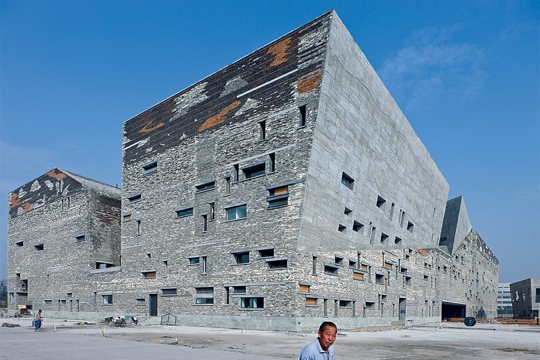 Naglasak na površinu i očuvanje lica (fasade) znače gotovo isto te su bez sumnje kulturološki ukorijenjeni u Kini. Wang duhovito reagira na tu nuždu – sa slojevitim, intrigantnim pročeljem koje proizlazi iz manjih eksperimenata u njegovim ranijim projektima ‘Pet raštrkanih kuća’ i sveučilišnog kompleksa Kineske umjetničke akademije. Utisnuti tragovi bambusovih letava možda bude sjećanje na beton brut, ali mogu se i protumačiti kao fosilni ostatci bambusovih šuma. Dvadeset različitih vrsta sivih i crvenih cigala i crepova – spašeni ostatci srušenih seljačkih domova – predstavljaju još jedan ‘arheološki’ sloj koji posuđuje tehniku od lokalne gradnje wapan, posebne regionalne tradicije gradnje privremenih zidova nakon udara tajfuna.