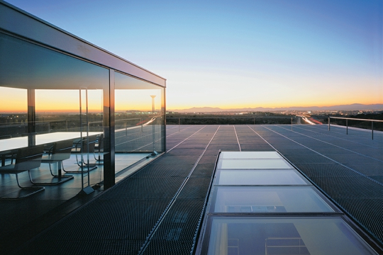 Veliko okno okrenuto prema zapadu uokviruje prekrasan krajolik sierre oko Madrida. Strukturalno – veliki betonski podij sadrži servisne elemente.