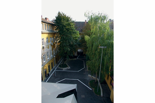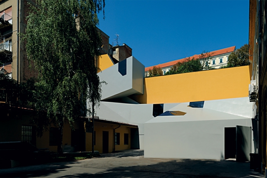 U samom dvorištu vlada ponešto komorna atmosfera jer nema praktički nikakvih javnih sadržaja, a i sama zgrada ZPC, koja zatvara stražnji perimetar bloka podno Griča, jest prema eksterijeru sasvim zatvorena. Tri plesna studija s pratećim sadržajima smješteni su unutar prilično skučenoga gabarita kinodvorane. Bivši ulazni prostor i stubište zamijenjeni su jedinom eksterijerskom novom strukturom – čeličnim kontejnerom u kojem je sklop s javnim prostorima: foajeom, stubištem i galerijom. Kontejner se razmata od partera dvorišta, priljubljuje i puže uza zgradu da bi se ‘zakačio’ na njenu krovnu terasu i oblikovan je tako da se nedvosmisleno čita kao autonomni, skulpturalni element s razlomljenom, zakošenom geometrijom, koja se jednako čita i u interijeru i u eksterijeru. Uvjerljivost i sugestivnost forme svakako treba pripisati i 3LHD-ovim istraživanjima kompaktnih slobodnih oblika. No, oblik i dispozicija kontejnera bitno su određeni i urbanističkim uvjetima i njegovim ‘izmicanjem’ od otvora na susjednim zgradama.