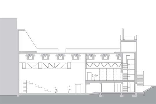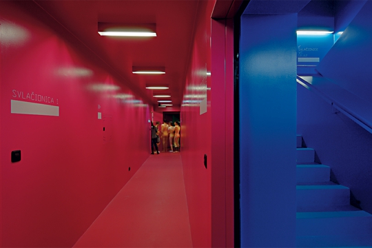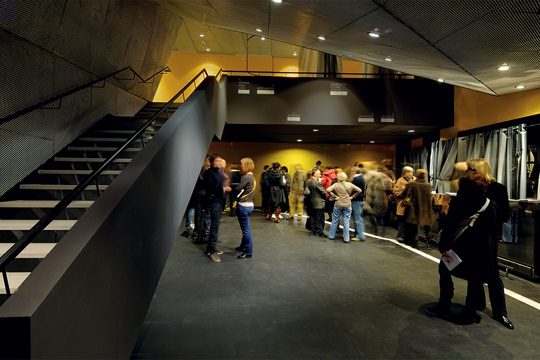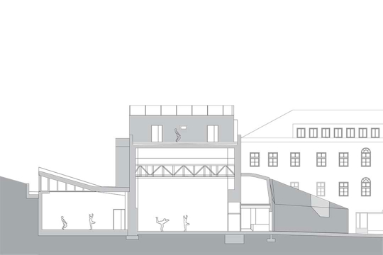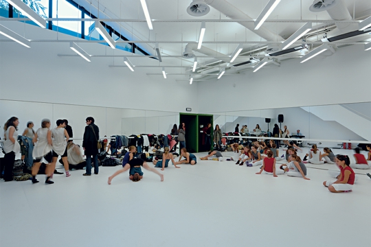 Pod foajea je lagano zakošen, vanjski gabariti i otvori također slijede neortogonalnu geometriju, pa prostor teče u sve tri dimenzije uza staru zgradu, čiji je zid i u interijeru ožbukan. Primijenjena su low-tech rješenja, ‘grubi’ materijali poput perforiranih i rastegnutih metalnih ploča/mreža i distorzirana geometrija, što sugerira ‘radikalnu estetiku’ blisku eksperimentalnom duhu scene suvremenih plesnih i izvedbenih umjetnosti. Detaljiranje i izvedba pak pokazuju projektantsku koncentraciju i preciznost, a pojedina rješenja, poput zastora koje je oblikovao studio I-gle, doprinose sofisticiranom dojmu. Same dvorane – glavna s teleskopskim tribinama i dvije za vježbe i probe su zajedno s pratećim sadržajima organizirane kao jednostavni i kompaktni trodimenzionalni sustav. Naročito je lijepa ‘bijela dvorana’ sa zenitalnim osvjetljenjem i pogledom koji se otvara prema ozelenjenom brežuljku. Ta dvorana ujedno je i direktno povezana s eksterijerom, što je čini i najugodnijim prostorom cijelog sklopa. Mogućnost povezivanja glavne dvorane s manjom dvoranom za vježbe, koja time postaje galerija, jest pak s čisto funkcionalnog stanovišta upitna jer se ne ostvaruje očigledno upotrebljivi prostorni međuodnos.