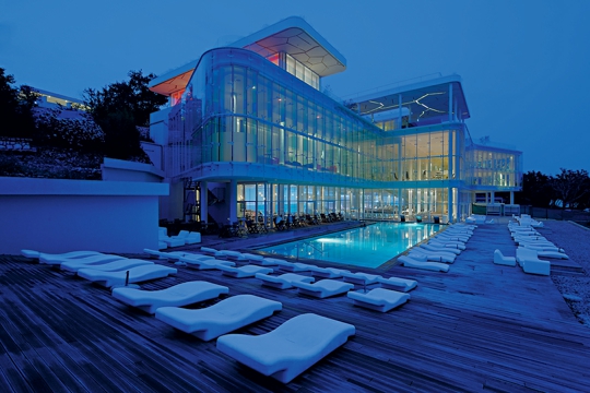 ...Arhitektura je u ovom slučaju ispravan i precizan odgovor na temu i razlog dolaska u taj svijet i na ovo mjesto. Upravo tim općenitim i viđenim elementima suvremenog društva i pojavnosti definira se specifičnost ove destinacije, te počinje biti razlog i želja za dolaskom i boravkom u njoj. Danas su u Novi Spa Hotels & Resort svi na određeno vrijeme zvijezde i zečice iz Penthausova okvira Haludova. Tu je svatko na tren Bob Guccione i starleta iz Bondova filma. Idealan okvir za nabrijavanje svakodnevice, rutina i navika globalnog trenutka. Stoga pri posjetu web-stranice ovog resorta, možete vidjeti i fotogaleriju sa svim celebovima koji posjećuju ovo važno mjesto. Možda neko od vas ili nas, poput Zdravka Čolića, Maradone, Ćire, Maje Šuput ili Gorana Ivaniševića, jednog dana bude u galeriji tih slika i potencijalnih prilika.