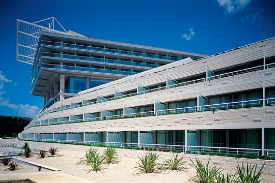 Novi hotel u Orašcu, u dubrovačkoj regiji, sastavni je dio turističkog kompleksa Dubrovački vrtovi sunca, čiji počeci sežu u osamdesete godine 20. stoljeća, a istovremeno se nadovezuje i na bogatu povijest razvoja turističkih djelatnosti s početka 20. stoljeća (tu mislim prije svega na Grand hotel Nikole Dobrovića na Lopudu) i razdoblja zrele moderne kada su na jadranskoj obali građeni veliki hotelski kompleksi. U starijoj povijesti Dubrovačke Republike su običaji provođenja ljeta izvan gradskih zidina i način proizvodnje hrane uvjetovali specifični oblik naseljavanja teritorija: nastala je mreža renesansnih ljetnih vila - ljetnikovaca s pripadajućim vrtovima. U njihovom se oblikovanju odražavaju utjecaji viđenog na putovanjima po mediteranskim i još udaljenijim zemljama s kojima su spretni Dubrovčani trgovali. Reprezentativne vile Vlajki u Orašcu i Gučetić u Trstenu nalaze se u blizini novog hotela. Obje vile još i danas iskorištavaju veliku kvalitetu prostora u kojem se nalaze, a čiju posebnu vrijednost zacijelo predstavlja jedinstveni pogled na morsku pučinu, na kojoj se nalaze pojedini otoci Elafitskog arhipelaga, svaki s vlastitom specifičnom siluetom. Orašcu pripada otok Koločep, a Trstenu otok Lopud.