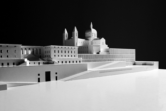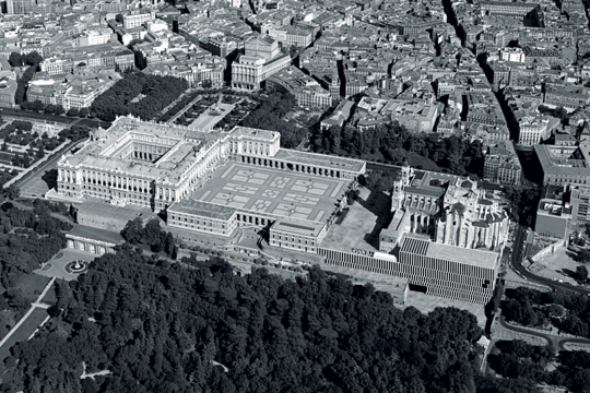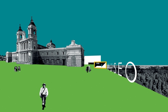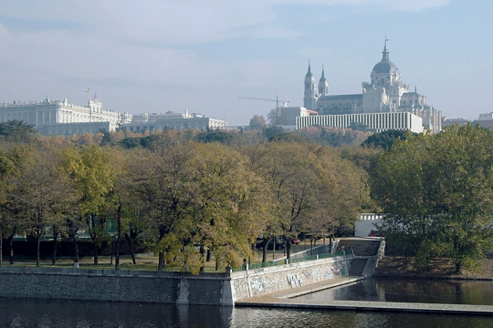 Zapadnu granicu povijesne jezgre Madrida čini slijed spomenika i trgova: Kraljevska palača (Madrid 1561. godine postaje kraljevska rezidencija) torinskog arhitekta Giovannija Battiste Saccetija, izgrađena između 1737. i 1760., s unutarnjim trgom Plaza Armeria i katedrala Almudena građena čak stotinjak godina, od 1883. do 1993. Položaj tih spomenika je markantan jer se nalaze na rubu visoravni odakle se teren strmo spušta prema kraljevskim vrtovima Campo del Moro i rijeci Manzanares. Obronak je, međutim, postao umjetni krajolik odnosno podnožje monumentalnog slijeda spomenika koji čine dijelovi kraljevske palače i esplanada, dok su ispod zapadne fronte Plaza de la Almudena izgrađeni potporni zidovi (1889. - 1905.). Izgraditi Muzej kraljevskih kolekcija kao novi, sastavni dio monumentalnog podnožja zaista je zadatak koji traži najveći angažman arhitekata, koncepte koji se s više strana mogu približiti problematici, koji neće praviti razliku između fizičke pojavnosti i apstraktne ideje kako bi se mjestu dodao novi povijesni sloj koji će biti otisak našeg vremena.