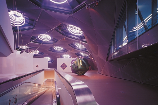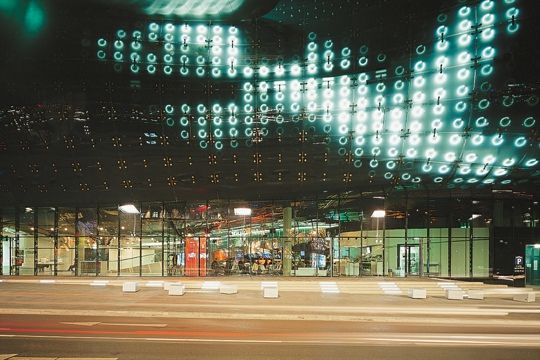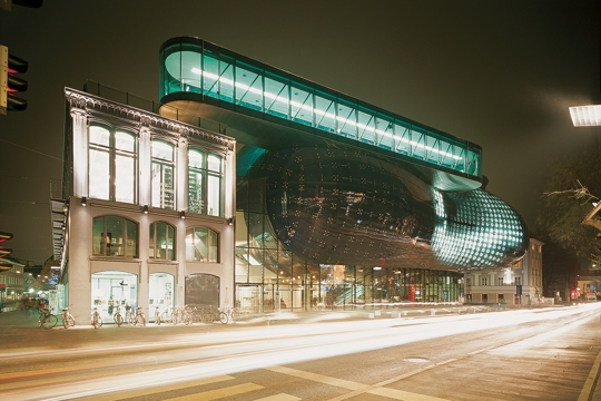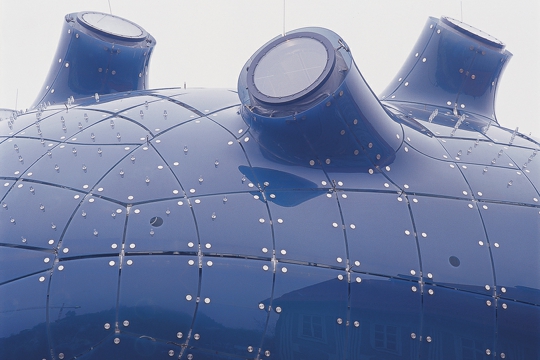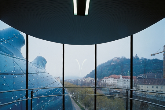 Kao što su autori Future Systems kod projektiranja robne kuće Selfridges u Birminghamu bili nadahnuti haljinom Paca Rabanna iz 1960-ih, obloženom metalnim diskovima, Kunsthaus – Friendly alien, muzejska zgrada inagurirana prošlog rujna u Grazu, zoomorfnom strukturom nalikuje Melvilleovom (plavom) kitu, a aerodinamičnom siluetom zeppelinu koji dramatično aterira na zapadnu obalu Mure (protežući se usporedno s rijekom), u četvrt tradicionalno naseljenu imigrantima i modrim ovratnicima – lokaciju toliko kontroverznu da je morala biti potvrđena javnim referendumom. Archigramovci Peter Cook i Colin Fournier (“pop-konstruktivistički provokatori”, kako ih naziva Kipke), autori gradnje koja predstavlja eksces – ludički implement (alien) u provincijski formalizam (nema ničeg tradicionalnijeg od promjene, tvrdio je Cedric Price), obložili su zgradu panelima od dvoslojnog pleksiglasa pod kojim su pričvršćene 40-watne neonske cijevi svijene u gotovo punu kružnicu.