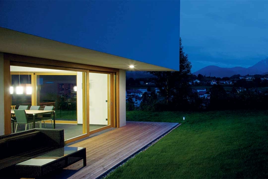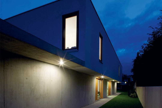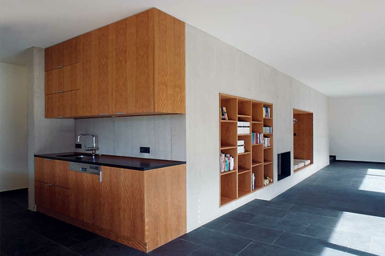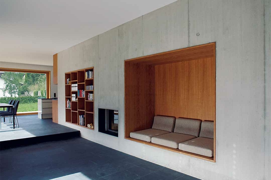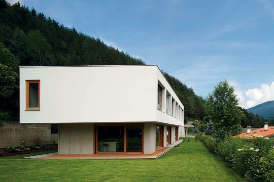 "Nismo željeli kositi tako puno trave", šaljivo objašnjavaju investitori svoje motive za izgradnju ove Two in one kuće. Neposrednog susjedstvo nipošto nisu vidjeli kao prijeteću opasnost. Parcela od 1500 m2 je, doduše, imala kompliciranu topografiju: "Parcela je vrlo dugačka i uska, pa je vrlo brzo bilo jasno da zgradu moramo nanizati poput lanca kako bismo je mogli orijentirati prema jugu", kažu Karin Triendl i Patrick Fessler. Osim veličine objekta i postojanja dvaju ulaza, izvana ništa ne ukazuje na činjenicu da je ovaj pravolinijski građevni korpus kuća za dvije obitelji. Slijed kretanja je jednostavan: uz garažu s velikim prostorom za parkiranje različitih vozila.