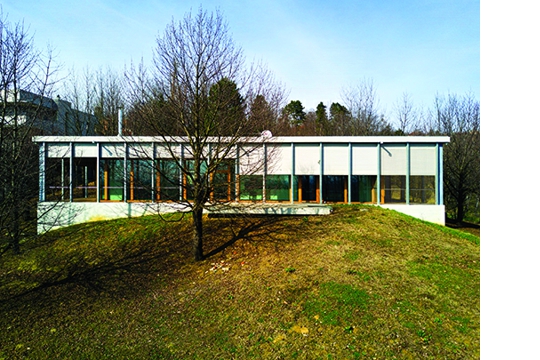 Nevelika prizemnica izmaknuta je u odnosu na susjede radi boljih vizura na parcelu, doživljaja većeg prostora. Izgrađena je na pregibu brežuljka gdje se blaga padina lomi bivajući strmija prema jugu. Radi se o klizištu, pa konstrukcija mora pridržati brijeg: temeljna ploča prerasta u tehnički podrum. Taj donji dio kuće je s krovnom pločom povezan dugim zidom sjevernog pročelja. Ova je struktura zaštitna ovojnica, betonski ormar u koji je umetnut dilatirani termički izolirani uložak, stambena drvena ladica. U njoj je glavna tlocrtna traka boravišnih prostora orijentiranih na jug i uža traka hodnika sa servisima duž dvostrukog sjevernog zida. Obodno, uz čitavo južno pročelje, proteže se trijem koji se na bočnim krajevima kuće širi u natkrivene terase. Preko tih tranzicijskih prostora kuća je otvorena za interakciju s parcelom na tri strane: jug, istok i zapad. Stupanj interakcije modulira se otvaranjem staklenih stijena, interijerskom zavjesom za intimu spavaće sobe te obodnim roletama za regulaciju osunčanja i zaštitu od atmosferilija. Iako geometrijski iste, dvije terase pružaju sasvim različite doživljaje u smislu vizura, osunčanja, materijalizacije omotača i visinskog odnosa prema terenu. Relativno dugi putevi kretanja omogućuju mnogostrukost doživljaja duž promenade koja intenzivira percepciju pobuđivanjem osjetila unutar zaklona stvorenog arhitekturom. Arhitektonska promenada je beskonačna ravninska petlja: idealna trasa za svakodnevne šetnje. Upravo je u tijeku projektiranje složenije prostorne petlje – vrtne šetnice. Zadatak nimalo lak: na padini obrasloj drvećem planirati trasu nagiba do 6 %, bez rušenja stabala!