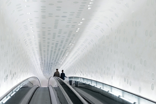 Također, prostorno je učinjeno sve kako bi doživljaj bio optimalan. Na primjer, kad je riječ o jedinstvenom doživljaju ulaska preko zakrivljenih pokretnih stepenica, prvih takve vrste u svijetu, na kojima se nitko ne žuri i ne zaobilazi sporije posjetitelje jer je dvoipolminutna vožnja, koja se čini da traje beskonačno dugo, jedinstveni užitak, ili kada je riječ o inspirativno zbunjujućim putevima kroz predvorja prema pojedinim sjedalima u dvorani ili pak o traženju određenoga mjesta u velikoj dvorani, čija intimnost i blizina prema svima ostalima čine taj prostor tako bliskim.