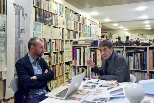 Studio Tadaa Anda smješten je u središtu Osake, u mirnijem kvartu nedaleko od glavne željezničke stanice. Omanja betonska zgrada izvorno projektirana kao obiteljska kuća, postala je znamenit Andov radni prostor koji je doživio više proširenja i dogradnji koji uključuju i sasvim novu zgradu na parceli s druge strane uličice. Središnji prostor studija vertikalna je praznina oko koje se obmataju uska stubišta i galerije. Ta zenitalno osvjetljena jezgra okružena je golemom kontinuiranom bibliotekom, a na nju su spojeni brojni, tipično gusto napučeni radni prostori. Razgovori s Tadaom Andom odvijali su se 26. i 27. travnja 2016. godine oko velike radne površine u prostoru prizemlja, uz prisustvo nekoliko Andovih suradnika, između skica, modela i nacrta aktualnih projekata. Za razliku od konvencionalnog, precizno strukturiranog intervjua iz 2010. godines pripremljenim sinopsisom te neformalnog susreta 2012., ovoga puta su se razgovori odvijali u dinamičnoj atmosferi usred radnog procesa u studiju.