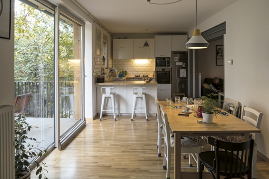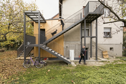 Dogradnja obiteljske kuće koju je Tomislav Pavelić projektirao za obiteljski bliske naručitelje nalazi se na sjeverozapadnom dijelu zagrebačke Trešnjevke, u gustoj mreži uskih stambenih ulica koje se granaju iz Zagorske, a u kojem se radničke kuće iz sredine prošlog stoljeća, okružene dvorištima, garažama i radionicama, miješaju s (još uvijek rijetkim) predimenzioniranim prostornim otiscima tranzicijske urbanizacije, stvarajući proturječan ali nevjerojatno intiman i životan ambijent. Dogradnja se oslanja na sjevernu polovicu dvojne kuće, podignute krajem 50-ih godina 20. stoljeća, i zauzima nišu nastalu razlikom u dubini spojenih kuća, stvarajući dojam više dopunjavanja nego proširenja otiska kuće.
