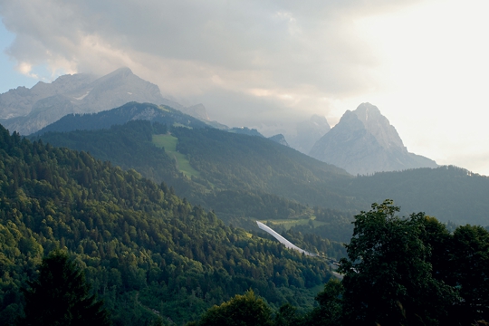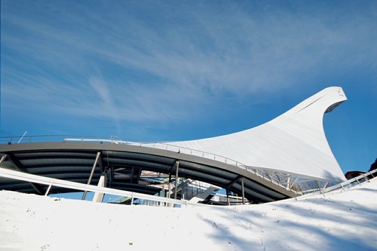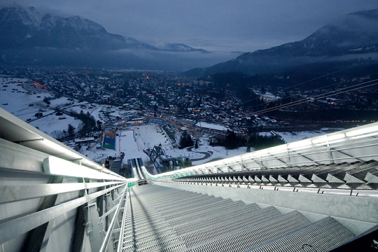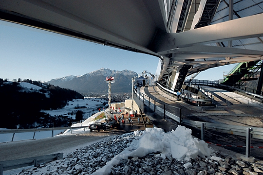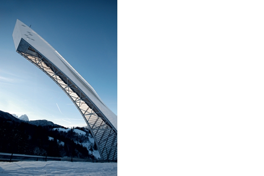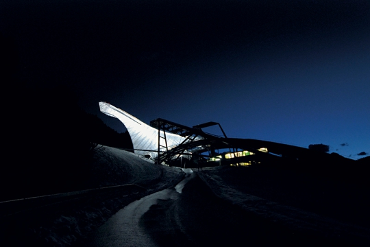 Kratki osvrt: Na jednoj od najznačajnijih točaka u Alpama, na vjerojatno najvažnijem alpskom prijelazu, na brdu Bergisel kod Innsbrucka, iznad vršaka šumskih krošnji nalazi se stakleni kokpit, s kojeg kao da se upućuju pozdravi vozačima automobila i kamiona koji prolaze mimo. Noću ga možemo percipirati kao užarenu mega-buktinju, kao da treba poslužiti kao putokaz vanzemaljcima. No, radi se tek o novoj skijaškoj skakaonici, koju je 2002. godine projektirala za Innsbruck jedna iračka arhitektica s boravištem u Londonu - svjetska zvijezda Zaha Hadid je za sebe tipičnu fluidnu formu transportirala u otvoreni planinski krajolik. Time je počelo novo razdoblje građenja u alpskom prostoru. Naime, svojim dinamičnim, fluidnim oblikovnim jezikom (netko u ovom sportskom objektu prepoznaje kobru, drugi pak vrat labuda sa staklenim kljunom) postavila je landmark na sjevernoj rampi autoceste za Brenner i izazvala veliki nemir u dotada jednostavnom i tradicionalnom alpskom arhitektonskom svijetu. Brojna mjesta, koja međusobno konkuriraju, prihvatila su ovaj izazov. Uz hotele, pansione i planinska skloništa nastaju u sve većem broju super skakaonice i skijaški stadioni, wellness objekti, vidikovci ili nove postaje uspinjača. Skijaški putujući cirkus profesionalaca i amatera predstavlja garanciju blagostanja u Alpama, gdje ne postoji druga vrsta industrije, a poljoprivreda tek životari. Ipak dilema leži u činjenici da ljeti kao i zimi turisti dolaze zbog lijepog, nenarušenog krajolika koji je ugrožen svakom novom infrastrukturnom građevnom mjerom.