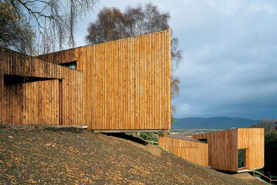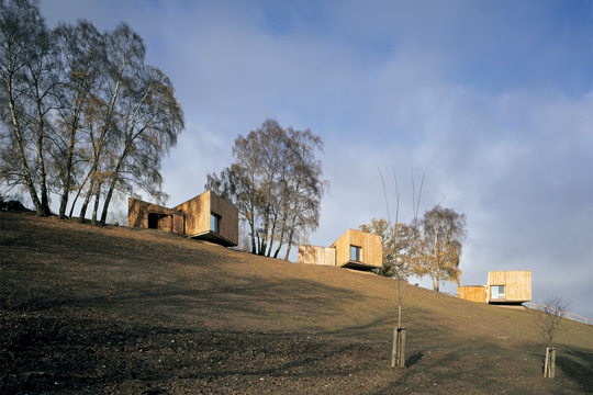 Tri “pustinje” su postavljene na sjevernom obronku brda koje gleda na glavnu stambenu zgradu imanja iz 19. stoljeća, dok je četvrta, za osobe s fizičkim poteškoćama, nešto udaljenija i nalazi se ispod njih, na obali ustave. Gledano iz velike kuće i njenog prilično zamršenog sustava jezeraca i niskih kamenih zidova tri kolibe se blago nameću značajnim dostojanstvom. Uz svaku jedinicu je drvo srebrne breze, a sve su povezane puteljkom čiji diskretni obris čini luk koji počinje i završava potočićem. Tako dobivena kompozicija daje prividan dojam neizbježnosti, premda su konačni položaji određeni tek nakon što su modeli od šperploče u punoj veličini postavljeni i pomicani po terenu da bi se dobili optimalni vidici i orijentacija.