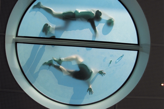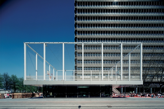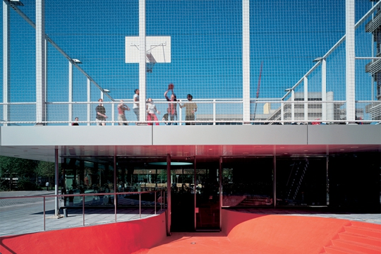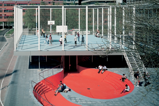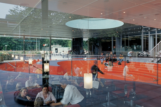 Kampus Sveučilišta u Utrechtu OMA planom se pretvara iz monokulturnog u gradski prostor, a postojeća knjižara uz proširenje – bar-kavanu i igralište – postaje neformalno, dnevno i noćno sastajalište studenata, nastavnika i sportaša. Parcelu određuju 80-metarski Van Unnikov toranj iz 60-ih i obližnji Koolhaasov Educatorium iz 1997. godine. Visina knjižare od samo 2,6 m povišena je upuštanjem vanjskog “bazena“ i bara-kavane za 1,2 m. Zajednički strop-krov debljine 70 cm, ograđen mrežom visine 9 m, koristi se kao igralište 19x21 m za hakl u košarci. Ostakljeni krug u centru je i svjetlik i ekran posjetiteljima bara-kavane kroz koji se mogu promatrati pokretne sjene igrača iz bizarnih vizura. U prostor bara-kavane ulazi se sa tri strane, a sa četvrte je vezan na knjižaru. Vanjski prostor, zanimljivo modeliran narančasti “bazen“, je višenamjenski: ulazna rampa posjetiteljima u kolicima, pista rolerima, amfiteatar i scena egzibicionistima, a terasa posjetiteljima. Tik do “bazena“ su čelične vanjske stube prema igralištu sa sintetskim svijetloplavim podom. Ista boja prelazi i na perimetar svjetlika u interijeru.