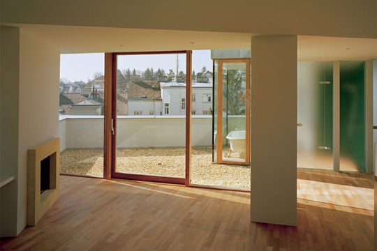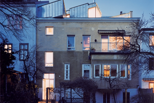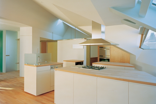 Pristup Holodecka je potpuno konceptualan, te nas vodi ka shvaćanju da koncepti koji nastaju iz razumijevanja prostora stvaraju stambene prostore koji odražavaju njihov smisao. Kad bismo mogli lebdjeti nisko iznad krova ove dvokatnice, vidjeli bismo njegove istake te shvatili obrazac koji je vidljiv samo iz gornjeg rakursa. Tu postoji veliki ostakljeni otvor, kvadrat 2x2 metra. Mogli bismo pogledati kroz taj prozor prema nebu te otkriti najintimniji dio ljudskog stanovanja – krevet potpuno istih dimenzija kao taj otvor koji gleda u nebo. Krevet okružuju zidovi koji su u potpunosti od tekstila prizivajući u pamet spavaće niše što nalikuju ormaru, kao i daleke suptilne reference na često objavljivanu spavaonicu koju je Adolf Loos napravio za Linu Loos. Kad bismo mogli lebdjeti tik uz uličnu fasadu, naišli bismo na kosi prozor koji označava kuhinju. Ponovo aktivnost koja se odvija unutra definira granice prema vanjskom svijetu. Ali se iz normalne ljudske vizure nikad ne susrećemo oči u oči s promjenama pod krovom na isti način, jer su one gotovo nevidljive za znatiželjne oči susjeda.