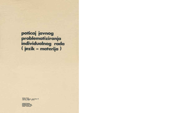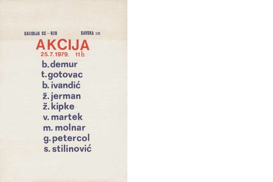 [1] Josip Stošić je predložio naziv za izložbu, a osim njega sudjelovali su: Boris Demur, Vladimir Dodig-Trokut, Ivan Doroghy, Ladislav Galeta, Tomislav Gotovac, Vladimir Gudac, Sanja Iveković, Željko Jerman, Željko Kipke, Antun Maračić, Vlado Martek, Dalibor Martinis, Marijan Molnar, Goran Petercol, Rajko Radovanović, Mladen Stilinović, Sven Stilinović, Goran Trbuljak i Fedor Vučemilović.