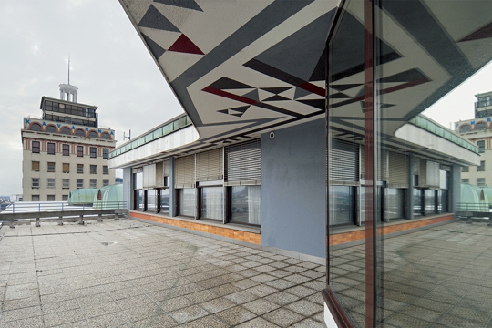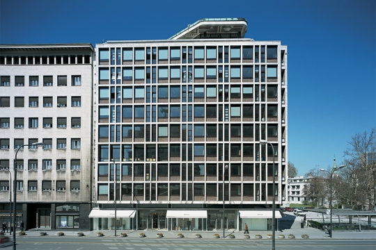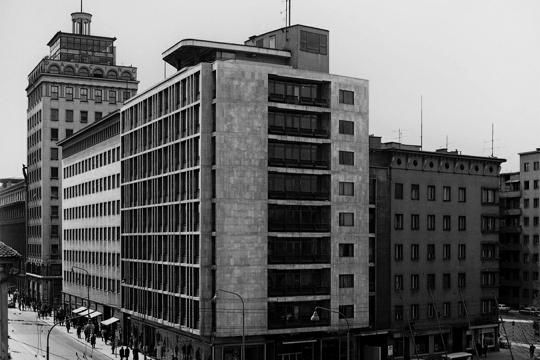 Početkom 50-ih godina srušena je znamenita ljubljanska gostionica “Figovec”. Veliko gradsko mjerilo sa Nebotičnikom na prvom mjestu, koje je u grad donijelo kozmopolitski duh, počelo je prerastati jednokatnice duž Slovenske ceste. Za prazninu između zgrade Zalta uz Argentinski park i palače Slavija na Slovenskoj cesti je 1953. godine raspisan javni natječaj. S prijedlogom izgradnje nove trgovačke kuće tvrtke “Slovenija auto” je na natječaju pobijedio arhitekt Emil Medvešček (1911. – 1963.), student Plečnikove škole. Kod izvedbe projekta mu se u birou Slovenija projekt nakon diplome na Arhitektonskom fakultetu u Ljubljani pridružio mladi arhitekt Oton Jugovec (1921. – 1987.), student profesora Edvarda Ravnikara. Rezultat njihove suradnje je harmonična cjelina, koja u opusima oba arhitekta predstavlja jedan od vrhunaca³, pa je još i danas kvalitetan primjer izgradnje profila Slovenske ceste.