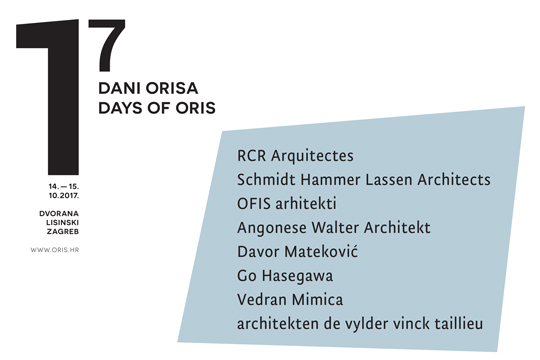 RCR Arquitectes je projektantski ured koji su 1987. godine osnovali Rafael Aranda, Carme Pigem i Ramon Vilalta u katalonskom gradu Olotu. Njegovi osnivači ondje i danas žive i rade, a njihova je arhitektura usko povezana s lokalnim kontekstom u kojem su ostvarili velik dio svojih projekata. Njihova suradnja s Orisom traje već petnaest godina, a u Zagrebu su gostovali još 2004. na Danima Orisa 4. Njihova poetika, zacrtana već u prvim radovima, razvijala se kontinuirano i dosljedno te su za svoj rad tijekom godina primili brojna priznanja i nagrade. U Zagreb se vraćaju kao dobitnici najprestižnijeg svjetskog arhitektonskog priznanja, Pritzkerove nagrade, koja im je dodijeljena u svibnju ove godine.