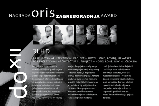 NovostiO Danima OrisaPrethodni DaniOris nagradaVikend s Orisom ORIS Zagrebgradnja nagrada, 2012. Početna stranica/Dani Orisa/Oris nagrada/ORIS Zagrebgradnja nagrada ORIS ZAGREBGRADNJA NAGRADA ZA IZUZETAN ARHITEKTONSKI PROJEKT, 2012. 3LHD, Hotel Lone, Rovinj, Hrvatska Obrazloženje žirija: Usklađivanje javne i privatne domene jedan je glavnih ciljeva napredno usmjerenih arhitektonskih praksi. To posredovanje između komercijalnih interesa te nastojanja da se građanima ponude poticajni i dostupni "urbani prizori" izazov je koji se razrješava i na razini same arhitekture, bez obzira na konvencije i ograničenja. 3LHD uspijevaju upravo u toj dvostrukoj namjeri: besprijekorno odgovaraju na zadatak projektiranja elegantnog i udobnog hotela, a da pri tome kreiraju dojmljive vanjske, a naročito unutarnje javne prostre. Formalno uzbudljiv hotelski hall istovremeno je i natkriveni trg koji je ispunjen kako raznolikom programskom ponudom, tako i inovativnom hrvatskom umjetnošću i dizajnom. 3LHD nadograđuju modernu tradiciju hotela na jadranskoj obali i realiziraju hotel koji nije samo "smještajni kapacitet", nego je i mjesto socijalizacije i svojevrsna galerija suvremene vizualne kulture. 3LHD ostvarili su doprinos lokalnoj zajednici koji također odgovara zahtjevima industrije turizma te su ponudili "prošireni koncept hotela" i naznačili evoluciju "pejzaža dokolice".