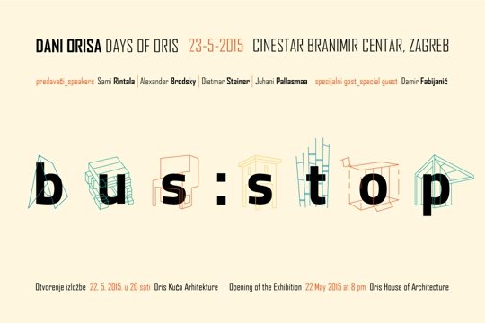 BUS:STOP Dani Orisa održat će se u subotu, 23. svibnja 2015. u Cinestar Multiplexu, Branimir Centar, Zagreb / Dvorana 9. Predavanja će održati Dietmar Steiner, Sami Rintala, Alexander Brodsky i Juhani Pallasmaa te poseban gost Damir Fabijanić.
