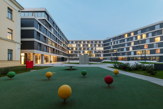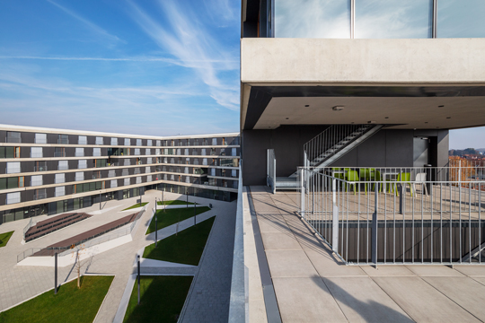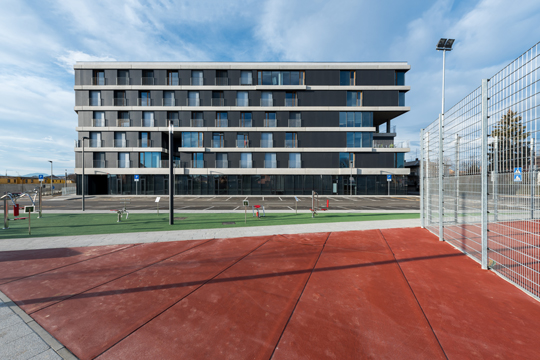 Arhitektonsko oblikovanje studentskog doma posve je u skladu s cjelokupnim pristupom projektiranju obilježenim brigom o svim aspektima humane i održive gradnje. Dinamični terasirani korpus nije nastao tek iz težnje arhitekata za efektom već ima svoju ulogu u pružanju mogućnosti korištenja slobodnog prostora. Ritam punih i ostakljenih ploha kao modulacija dinamičnih korpusa čimbenik je jednog arhitektonskog izraza koji je suzdržan i umjeren, no svojom samorazumljivom pojavnošću definira sliku gradskog ruba, a isto tako svojim korisnicima pruža mogućnost identifikacije.