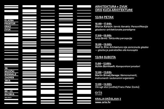 Svoju perspektivu ponudit će tijekom dva dana predavanja u Oris Kući arhitekture, 12. i 13. travnja, glazbenici, multimedijalni umjetnici i arhitekti. Sharon Kanach, glazbenica i potpredsjednica Centra Iannis Xenakis, govorit će o Xenakisovom djelovanju i utjecaju. Xenakis, inženjer po struci, bio je jedan od najvažnijih skladatelja svoje generacije i blizak suradnik arhitekta Le Corbusiera te je, kako Kanach kaže, definirao paradigmu glazba-arhitektura koja se pojavila u drugoj polovici 20. stoljeća nakon višestoljetnog ignoriranja te je dovela do razvoja umjetnosti novih medija. Arhitekt Ivica Brnić osvrnut će se, među ostalim, i na učestalu zabludu da je arhitektura „zamrznuta glazba“ (Schelling), kao i veliku zabludu da glazba nastane i nestane, te se pozabaviti promjenom agregatnih stanja Arhitekture kroz Glazbu u mjerilu promatrača, pri čemu se razmatra njihovo prožimanje. Wolf D. Prix, jedan od osnivača arhitektonskog biroa Coop Himmelb(l)au, govorit će o moći glazbe u arhitekturi te na nekoliko primjera pokazati na koji način arhitekti koriste glazbu kao jednu od svojih dizajnerskih paradigmi.