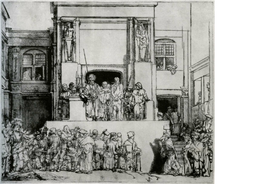 Standing before Rembrandt's precious 1655 dry point engraving, 'Christ Presented to the People,'1 I once pondered how the strokes set down by that genius’s hand bring to the fore the central horizontal line which functions as the base of the composition's construction. The upper plane of the stone platform, or stand, upon which the action of the scene transpires is placed at the height of the viewer's visual perspective, so that it becomes a line. This horizontal line is so perfect that one could say that Rembrandt used a ruler to make it. Or better yet, his hand was perfectly steady.
