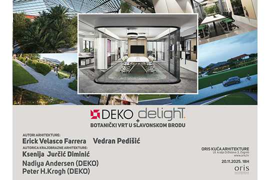 Pozivamo vas danas, 20. studenoga 2025. u 18 sati u Oris Kuću arhitekture, Kralja Držislava 3 u Zagrebu na predavanje u organizaciji tvrtke Delight i DEKO - vodećeg danskog proizvođača pregradnih rješenja za interijere. Gosti predavači su Erick Velasco Farrera i Vedran Pedišić koji će predstaviti arhitektonsko rješenje Botaničkog vrta u Slavonskom Brodu.