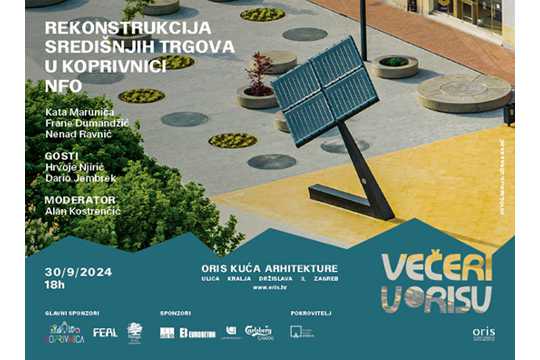 U Oris Kući arhitekture arhitektonski ured NFO predstavit će projekt Rekonstrukcije središnjih trgova u Koprivnici. Projekt je započeo dobivenim javnim natječajem 2019. godine te je polovicom 2023. godine završen. Obuhvat se prostire na gotovo 15.000 m2 te obuhvaća tri trga u strogom centru Koprivnice. Projekt je dobio posebno priznanje na Balkanskom bijenalu 2023. godine i treću nagradu City's Scape Award 2024. u kategoriji street landscape & slow landscape.